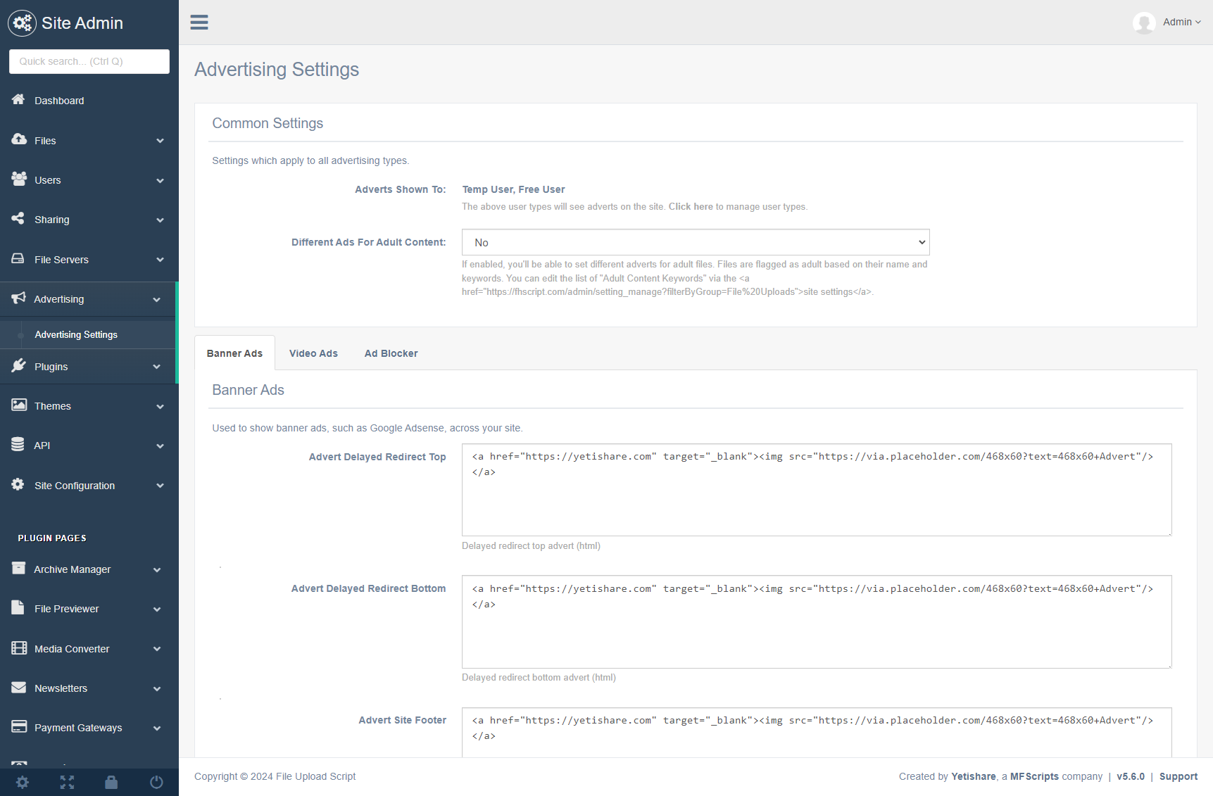 Advanced advertising management system with video ad support, content-based targeting, and user type controls for site monetisation.