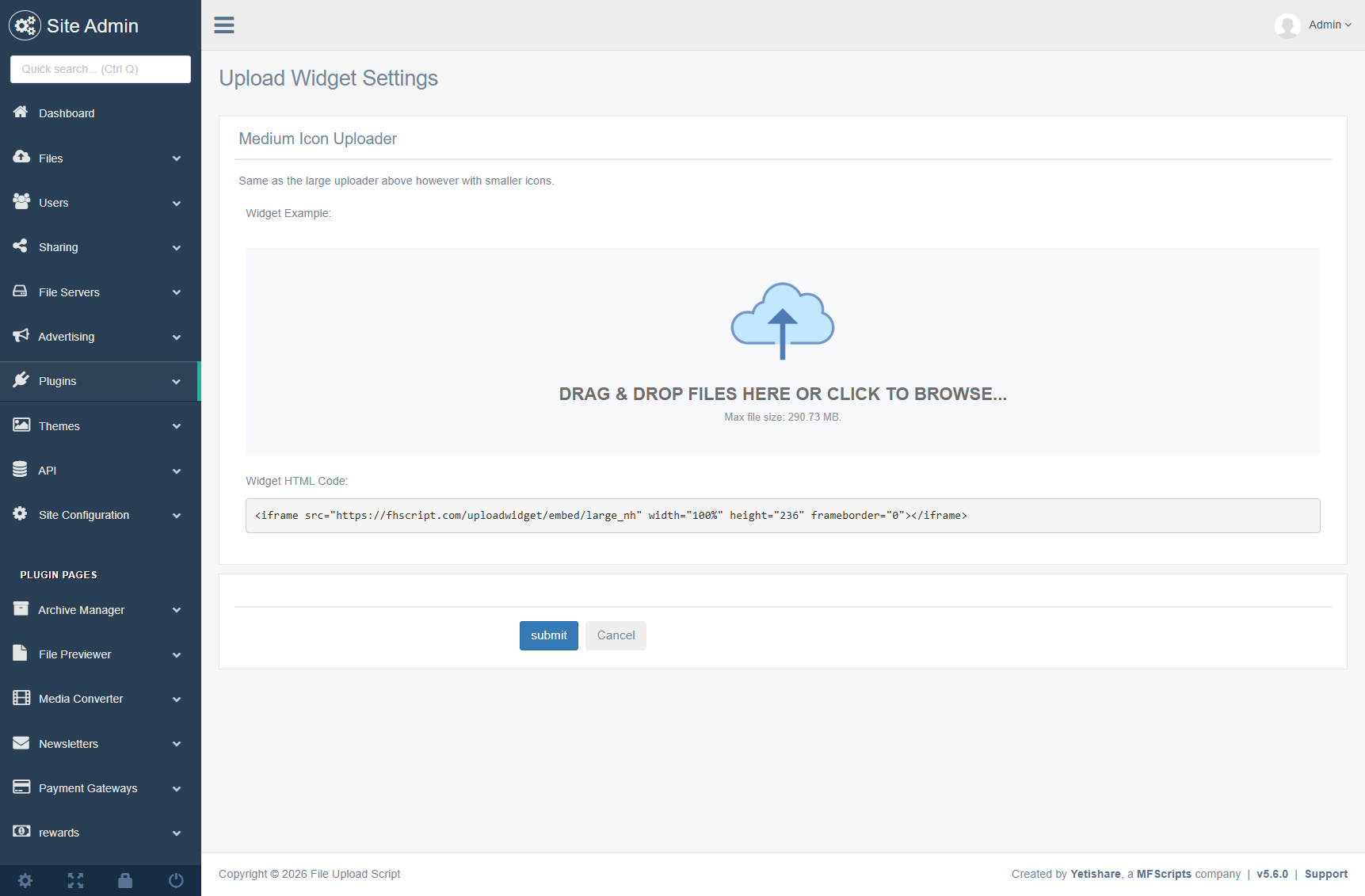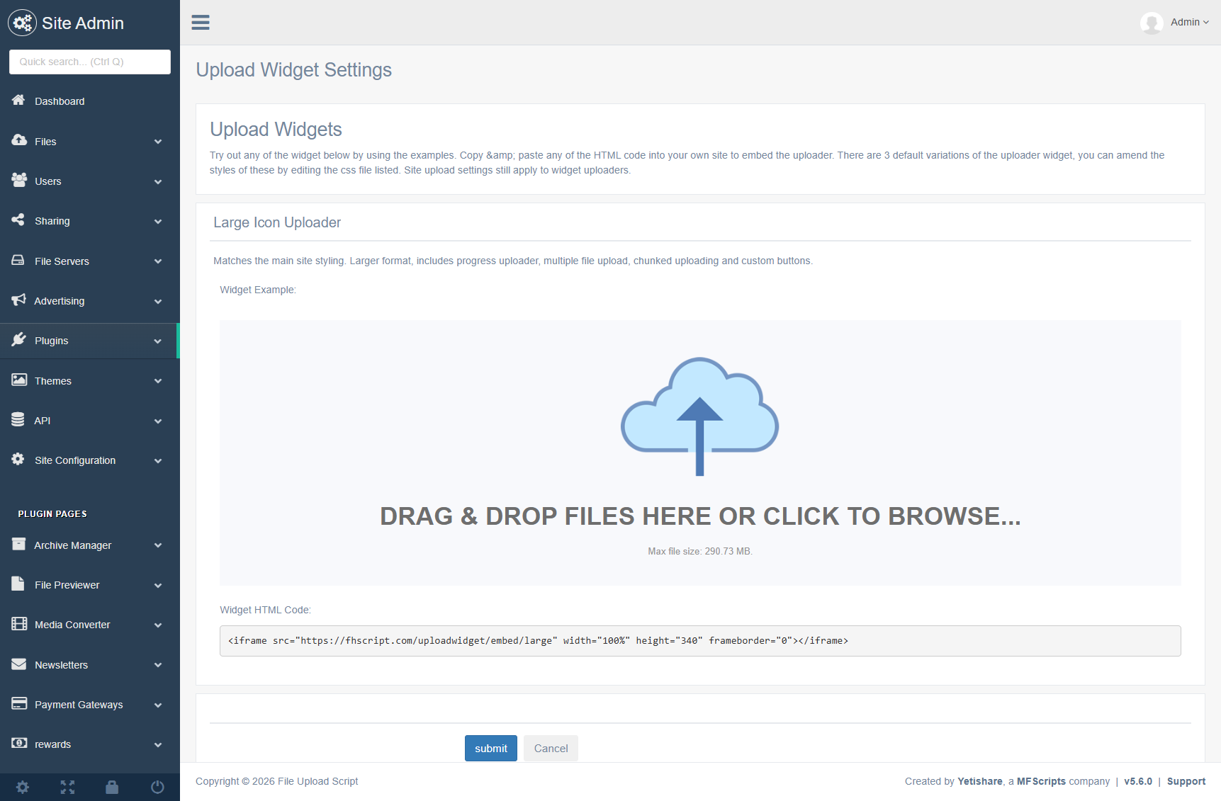 Drop the embed code into any HTML page; the widget handles uploads via your Yetishare site.