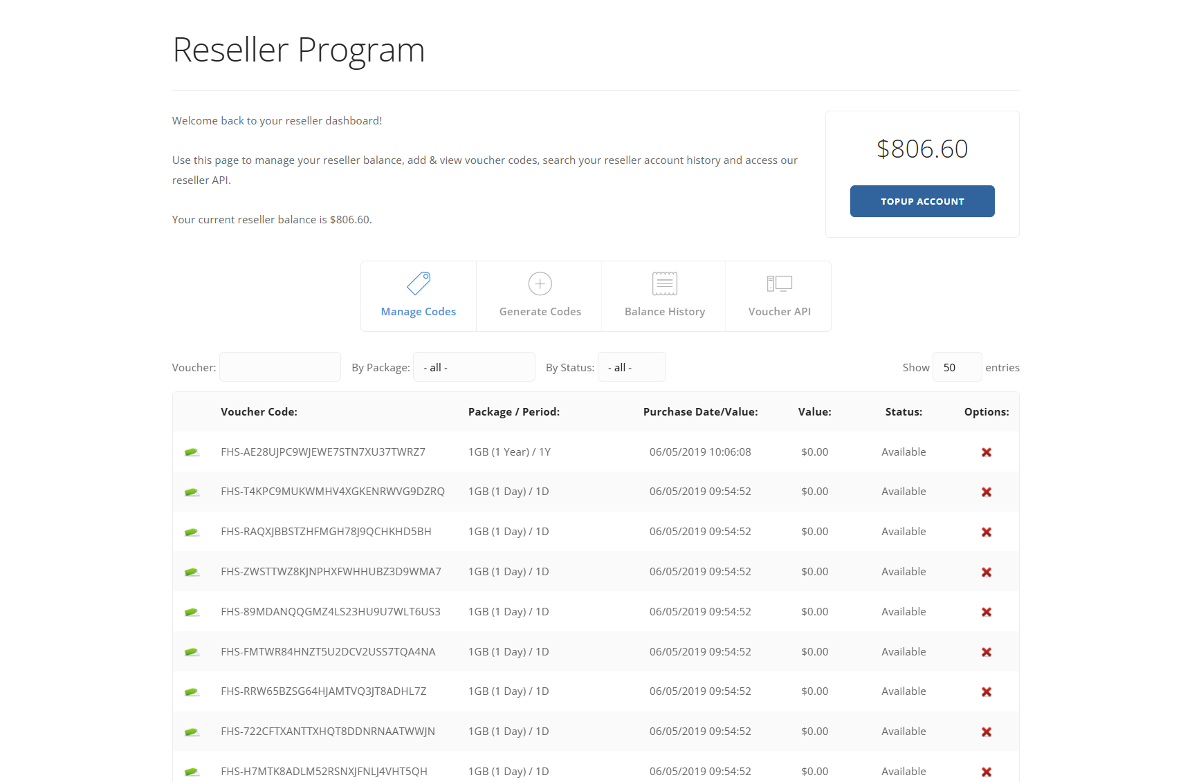 Cancel one or more vouchers; optionally manually override reseller balance; generate vouchers via admin for free by package, period and amount.