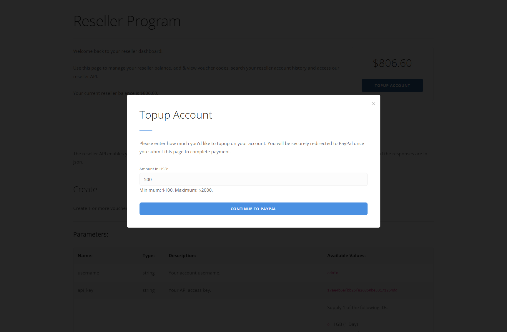 API access to create one or more vouchers externally from the site using the reseller's existing account balance.